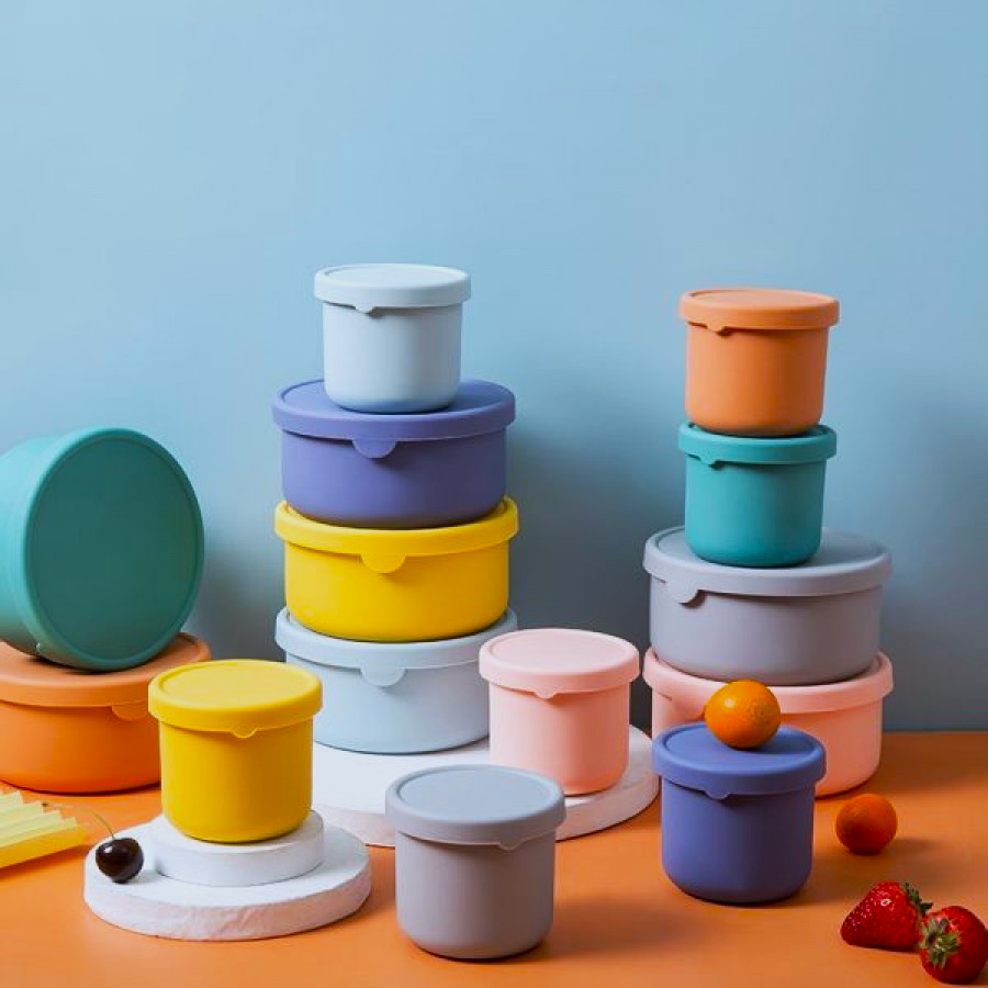 BPA Free 100% Food-Grade Collapsable Silicone Food Storage Container Set. Microwaveable and oven safe. Options Pink, Yellow, Blue, Green, Purple and Apricot.
